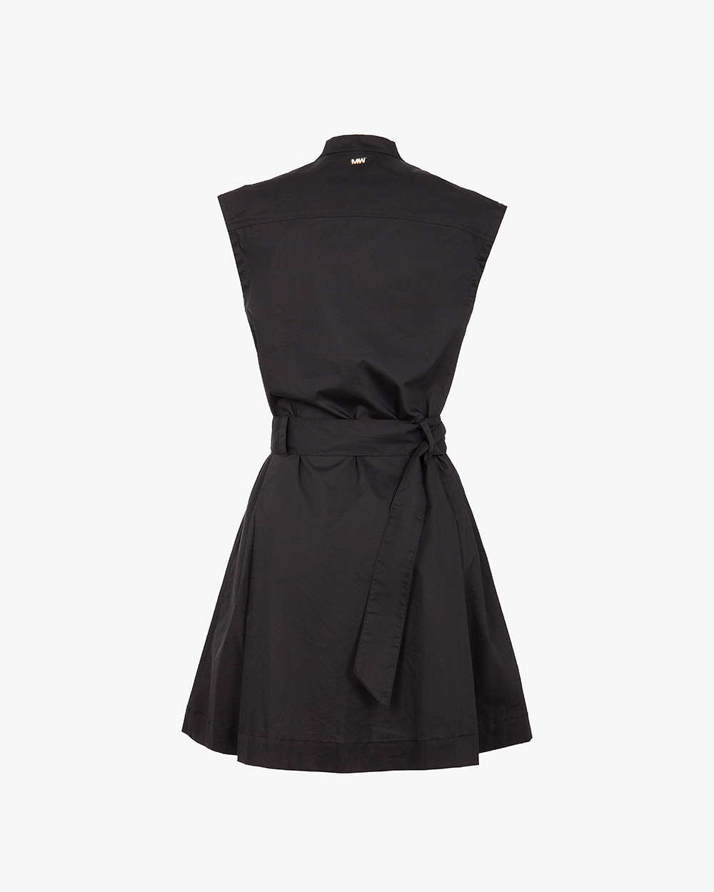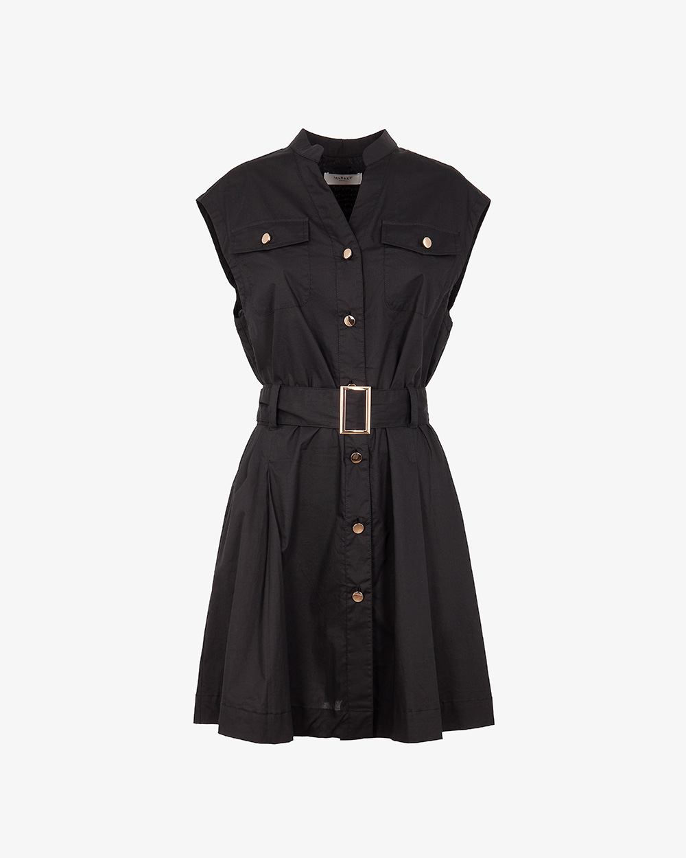 Abito corto smanicato con cintura, tasche e bottoni in metallo, in cotone.