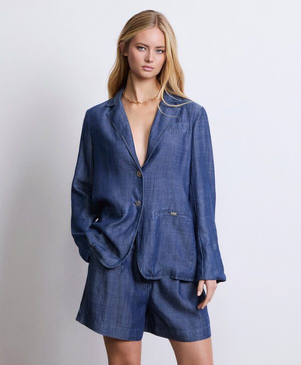 Blazer in tessuto effetto denim leggero, rever classici, chiusura frontale con bottoni, tasche applicate sul davanti. Vestibilità leggermente oversize, con spalle morbide e linea dritta.
