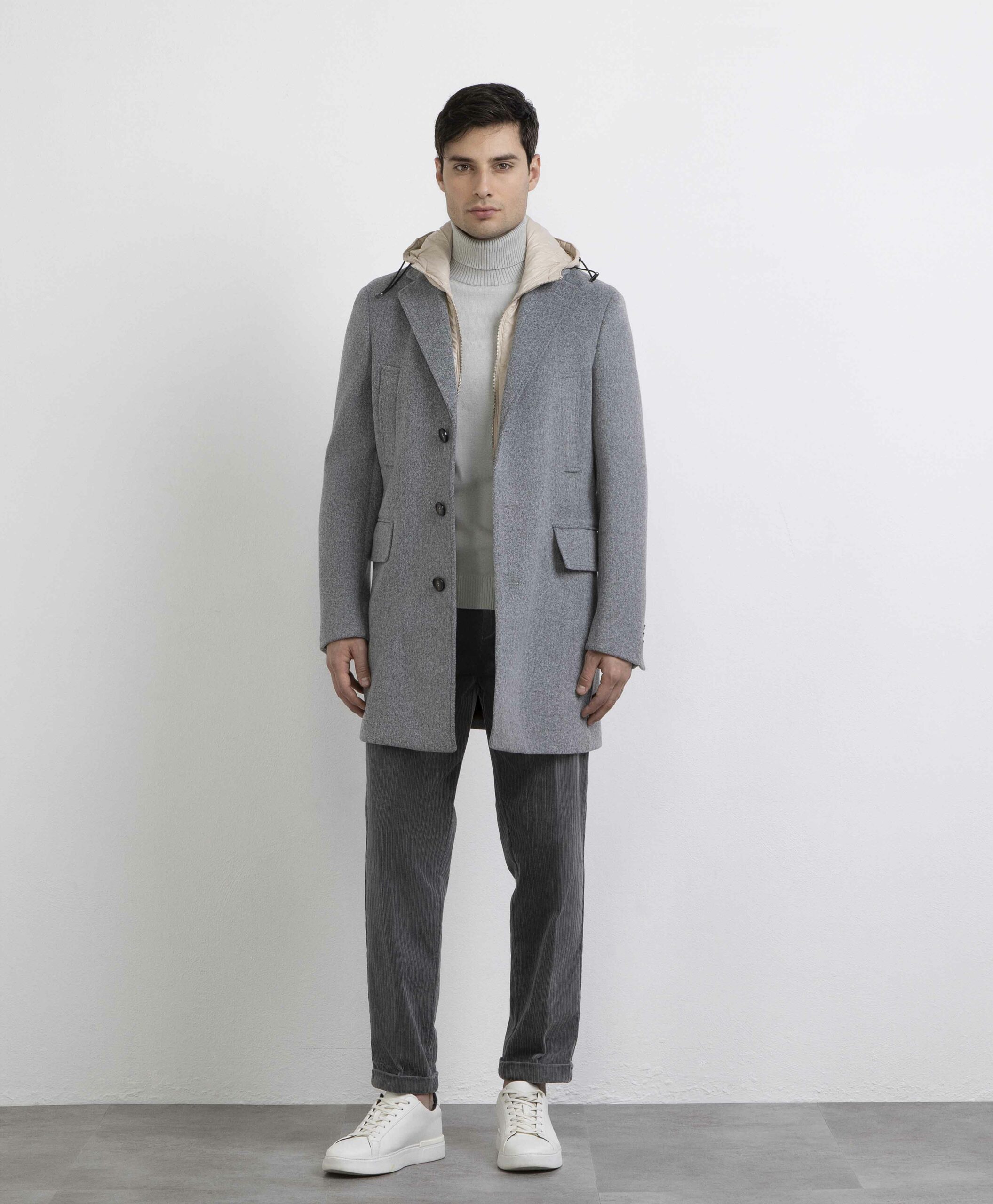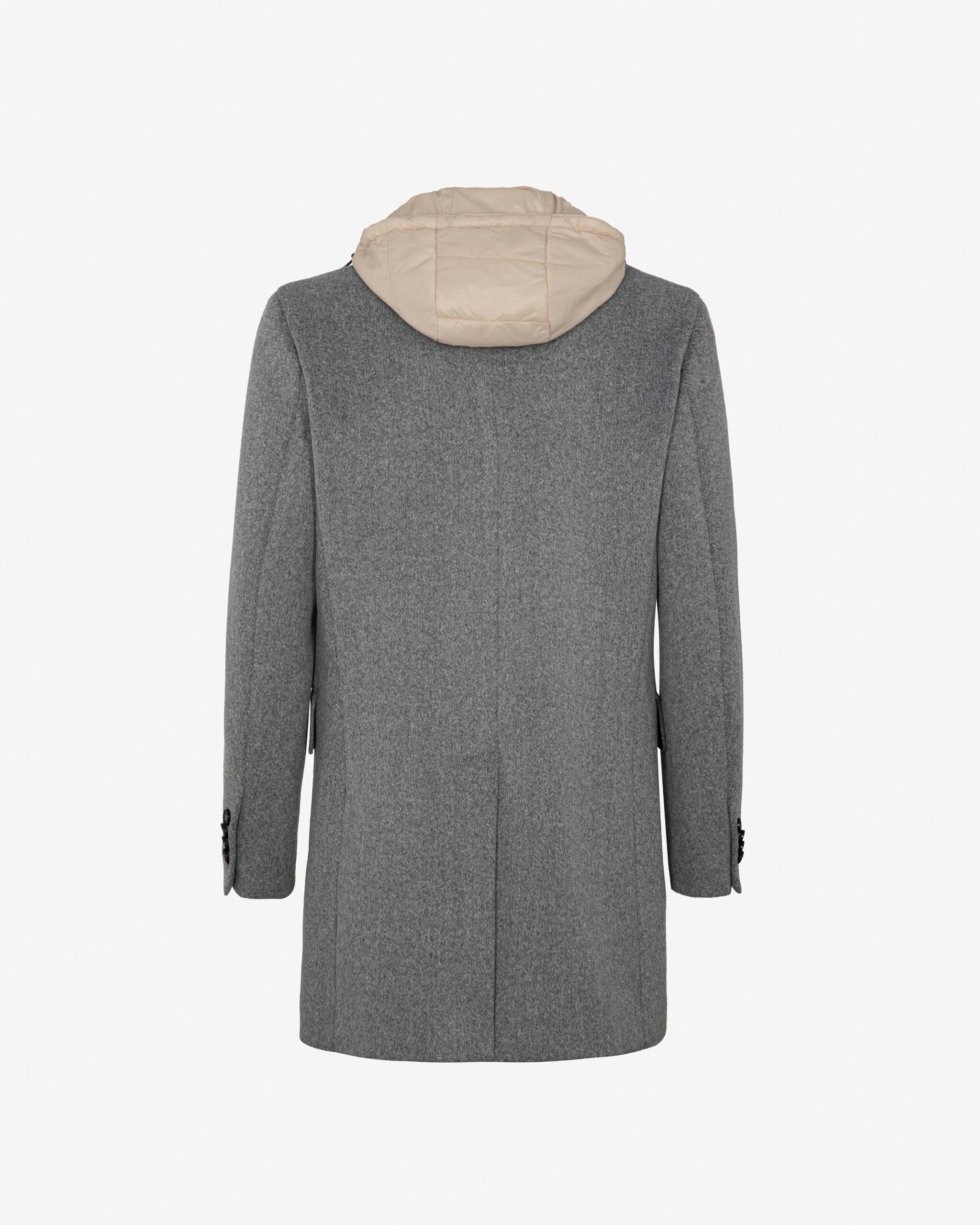 Cappotto panno double con pettorina e cappuccio tasche a filetto sul petto e con patta sui fianchi. Spacco centrale posteriore.