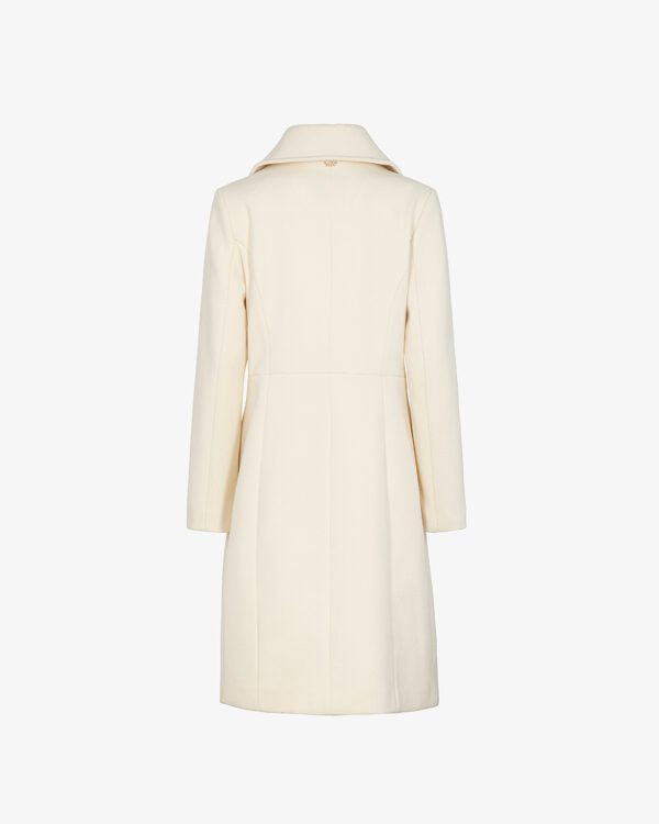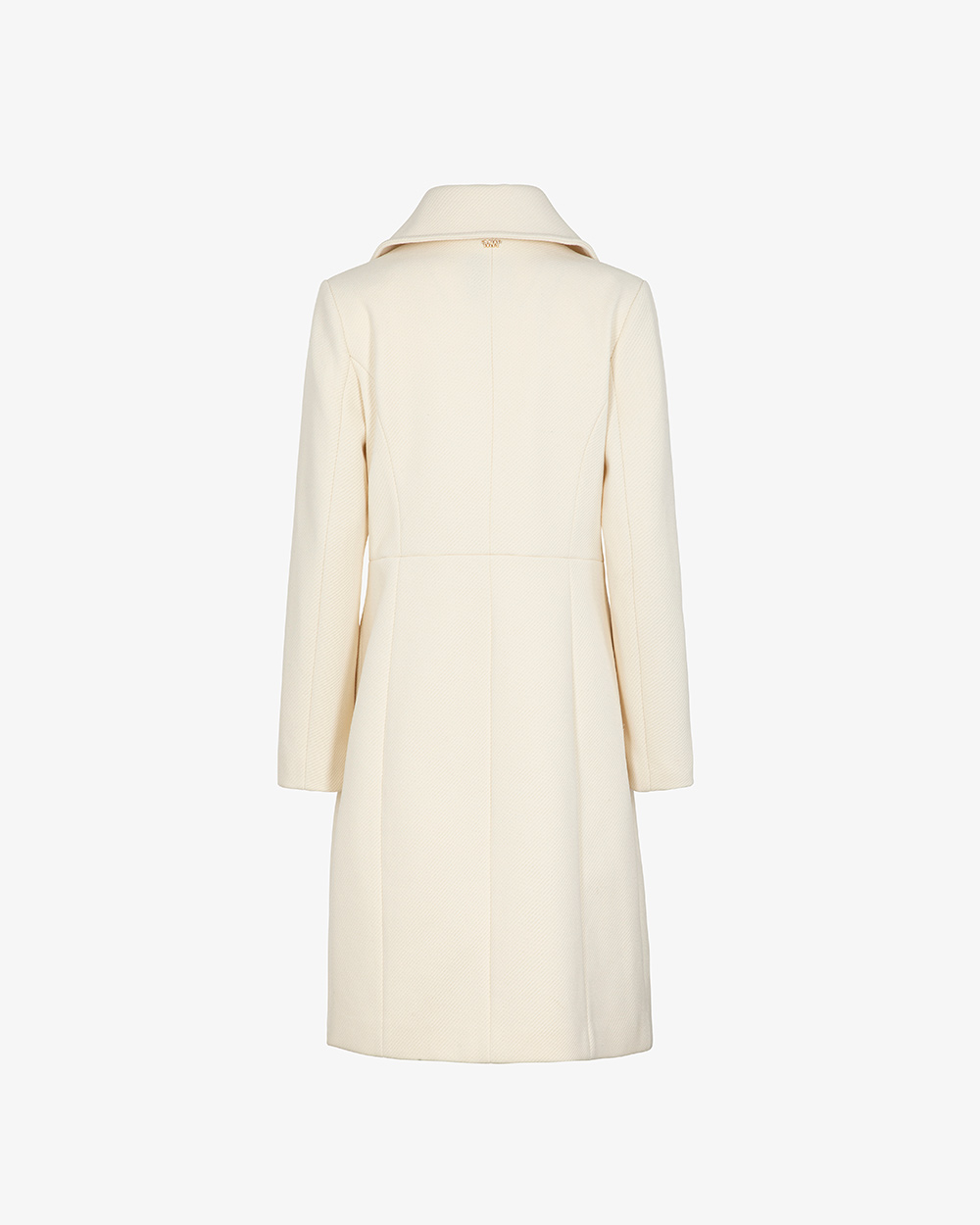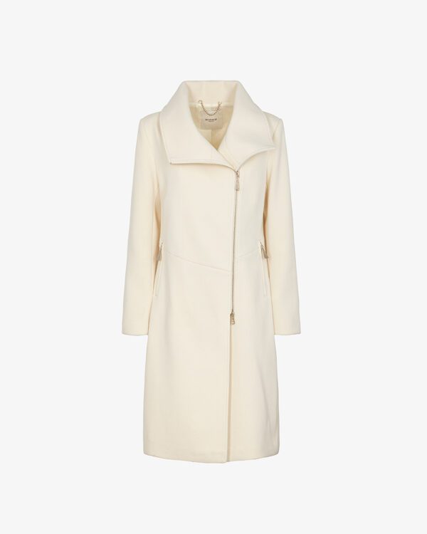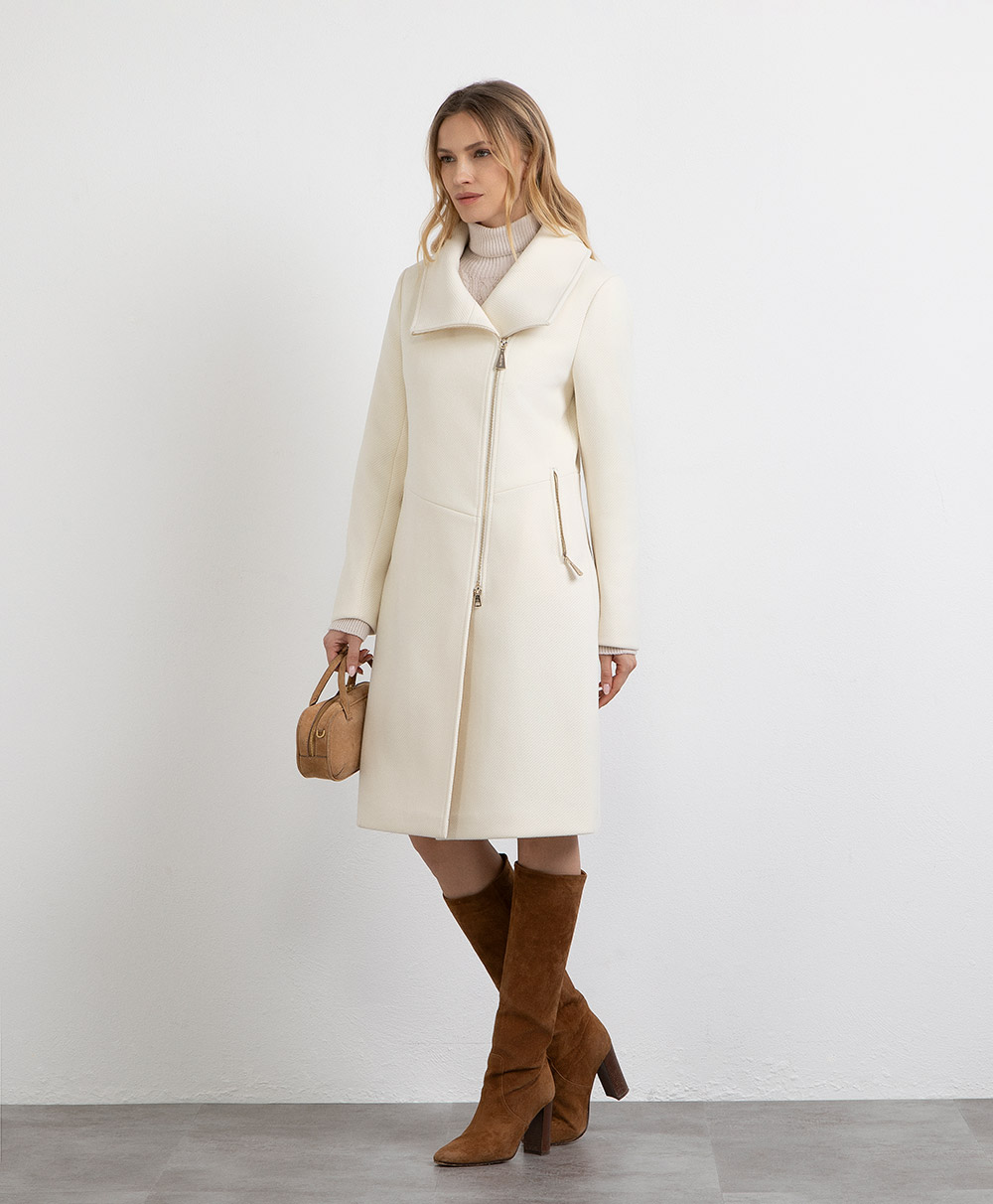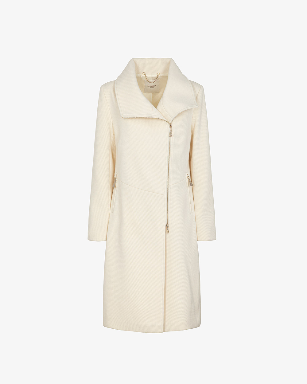 Cappotto in panno con tagli tessuto in diagonale chiusura zip decentrata collo ampio tasche anteriori con chiusura zip