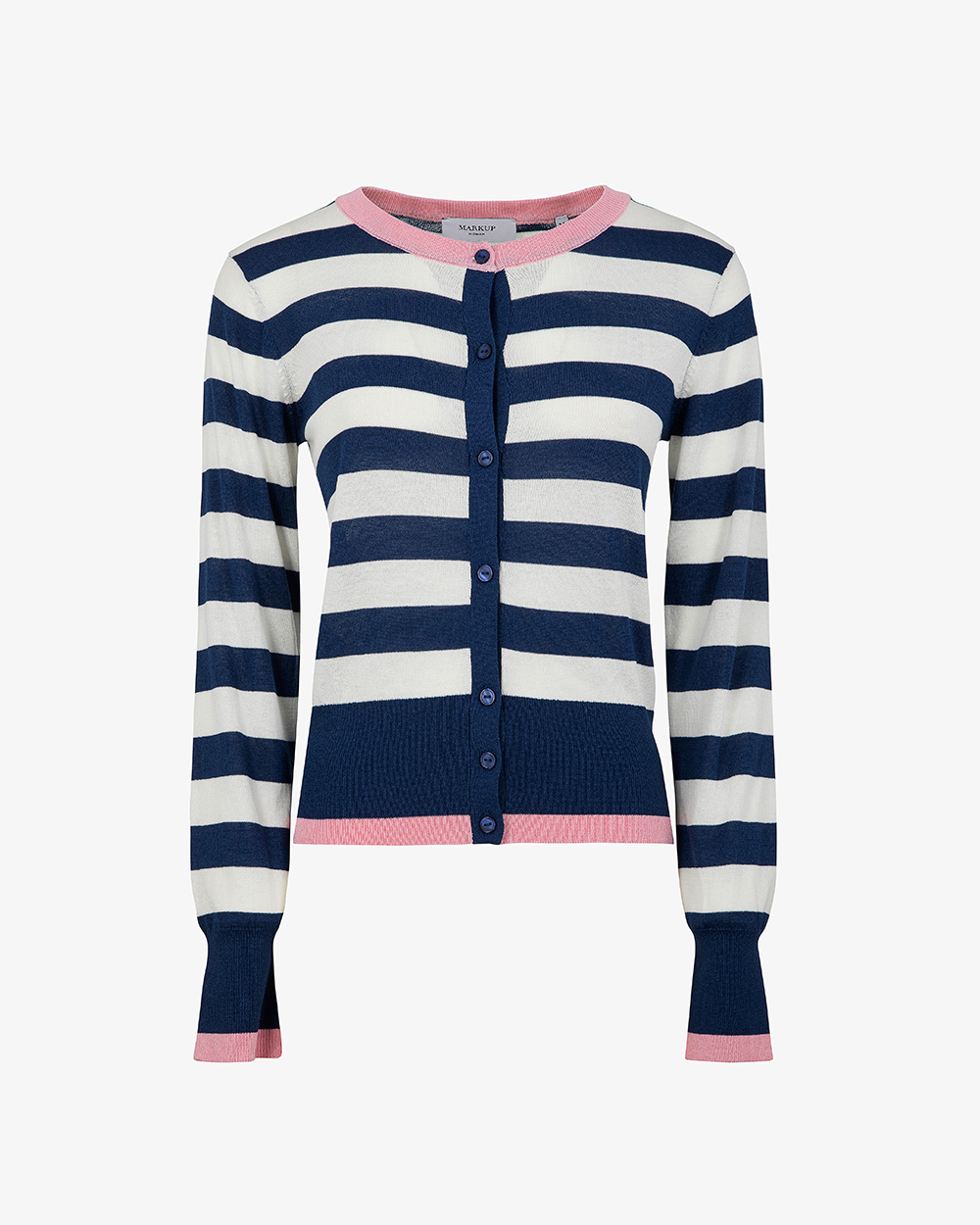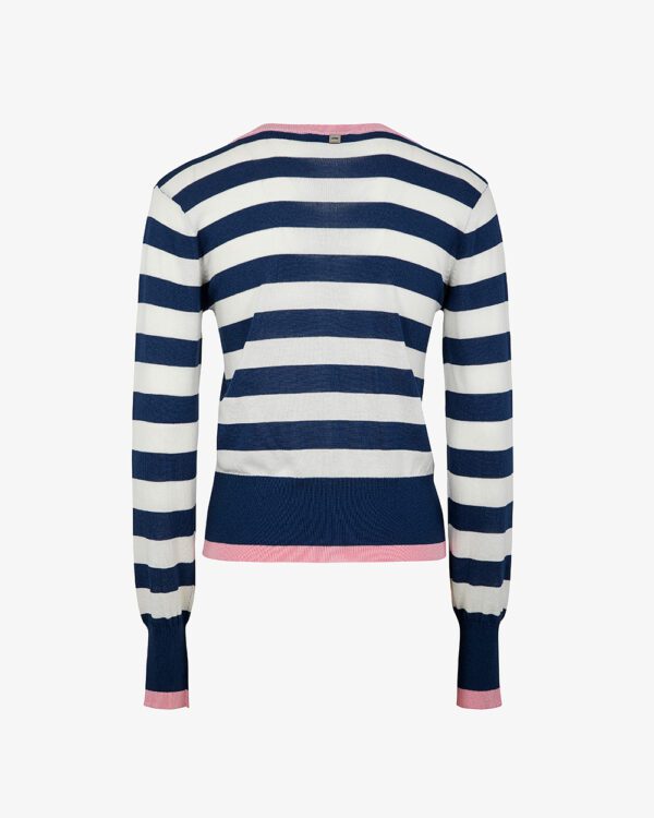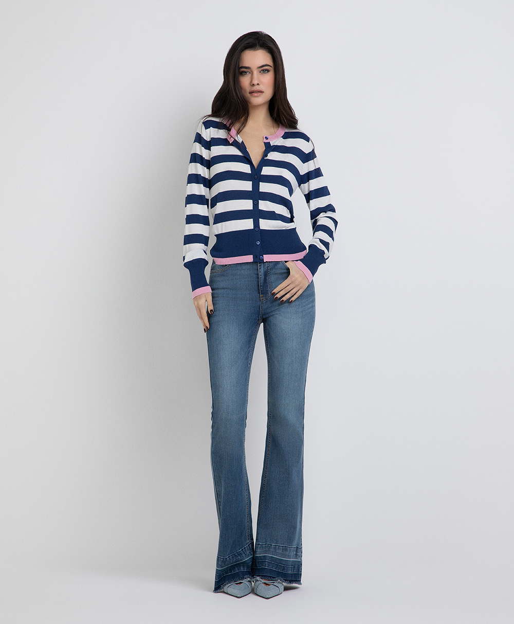 Cardigan manica lunga scollo a barca con bottoni a righe con bordi in contrasto in viscosa.