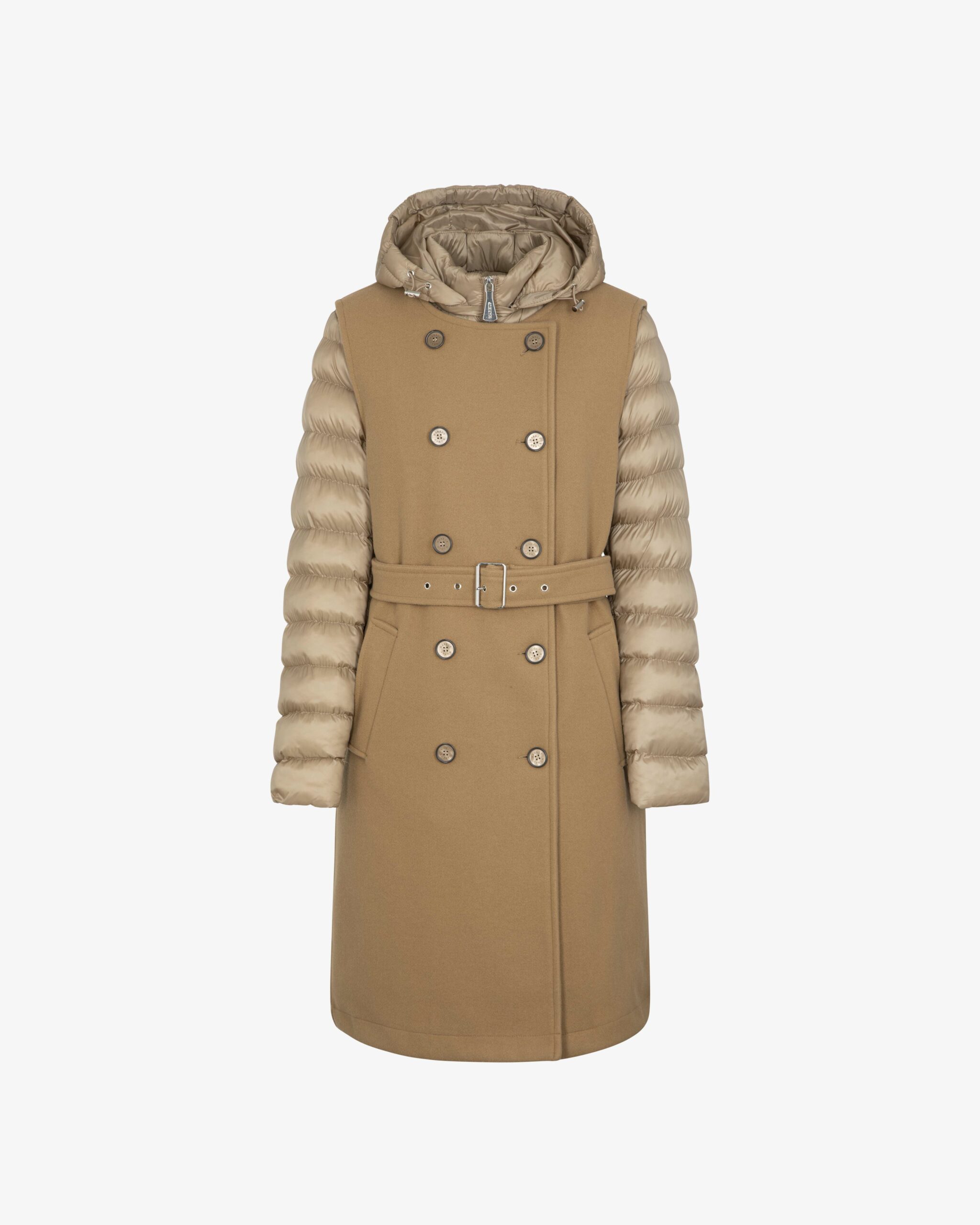 Gilet lungo doppiopetto in panno staccabile chiusura con bottoni e cintura piumino in nylon perlato con cappuccio