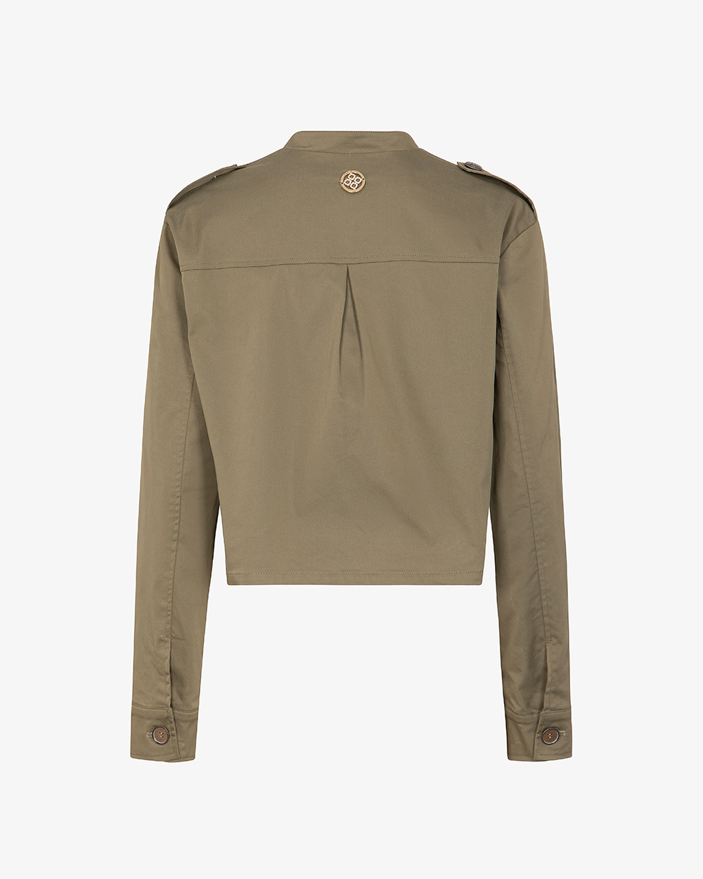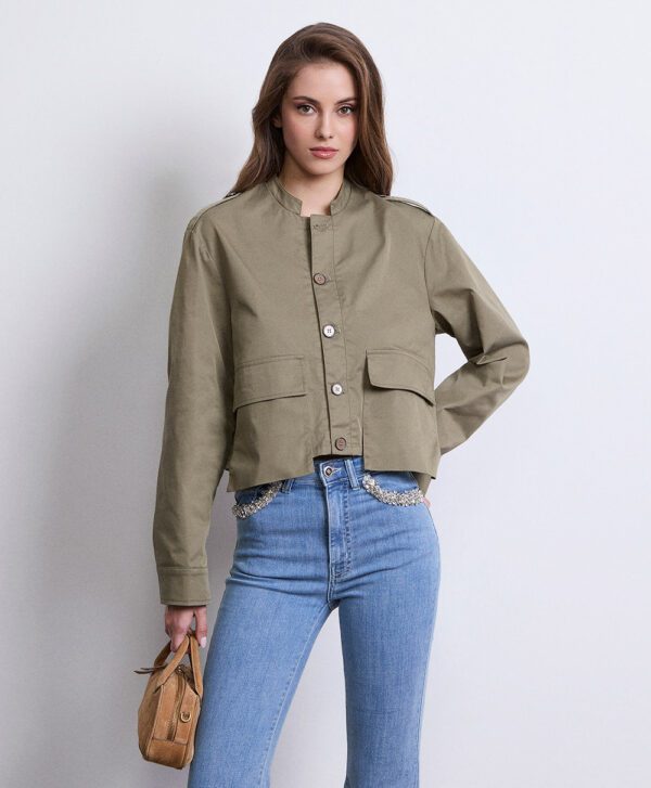 La giacca modello cropped, linea boxy, colletto alla coreana, chiusura a bottoni a contrasto. Ampie tasche applicate.