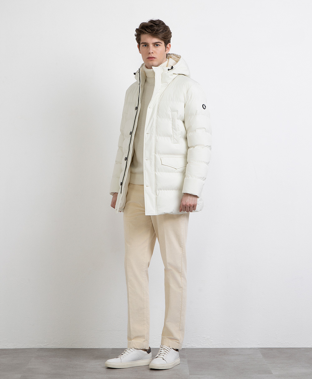 Long parka in microfibra con chiusura centrale zip e bottoni doppie tasche frontali