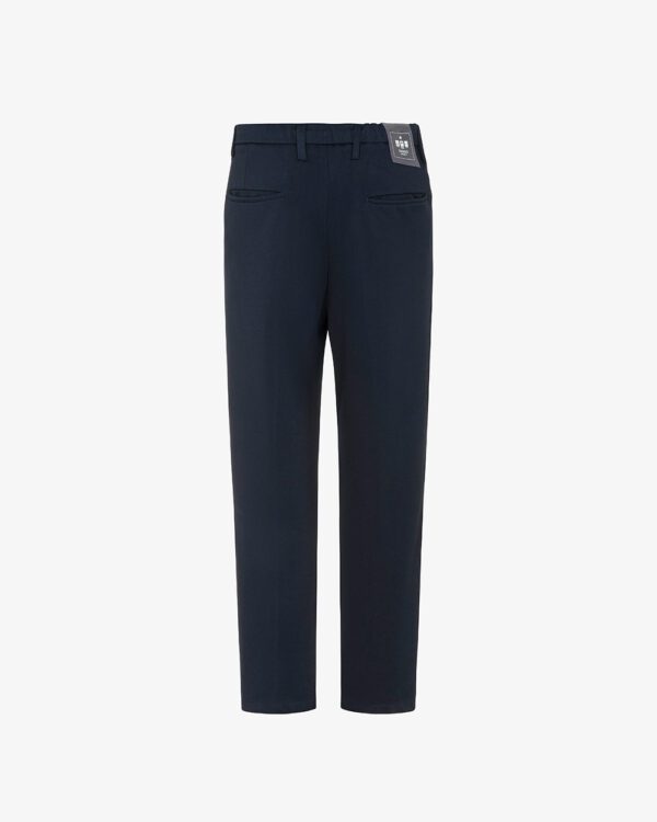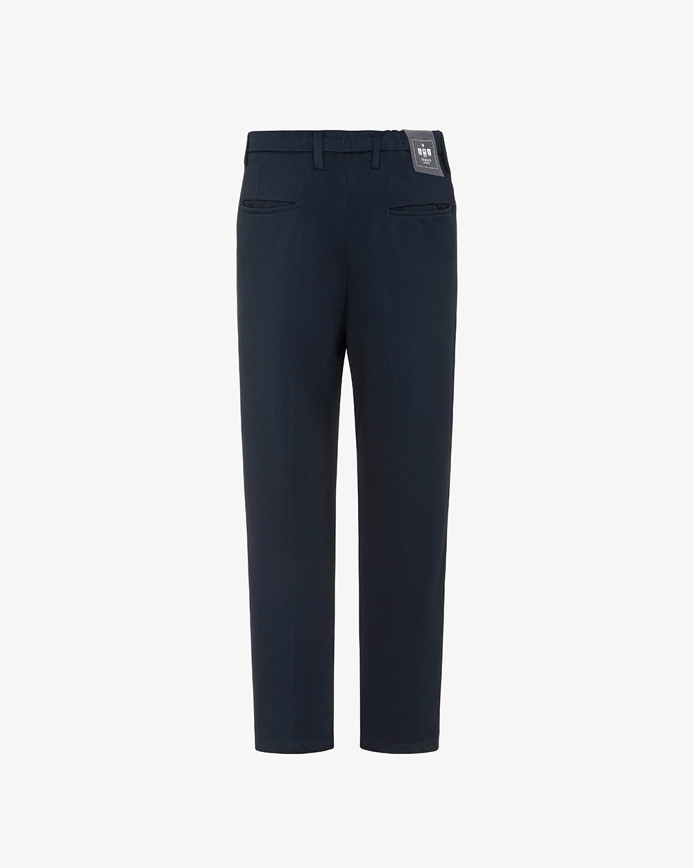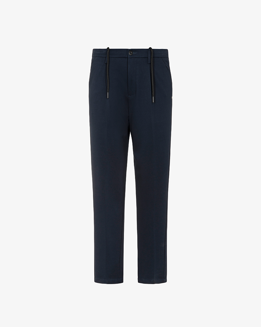 Pantaloni realizzati in tessuto punto milano. Pantalaccio fit. Tasche frontali e dettaglio di tasche a filetto posteriori. Chiusura frontale con cerniera e bottone.
