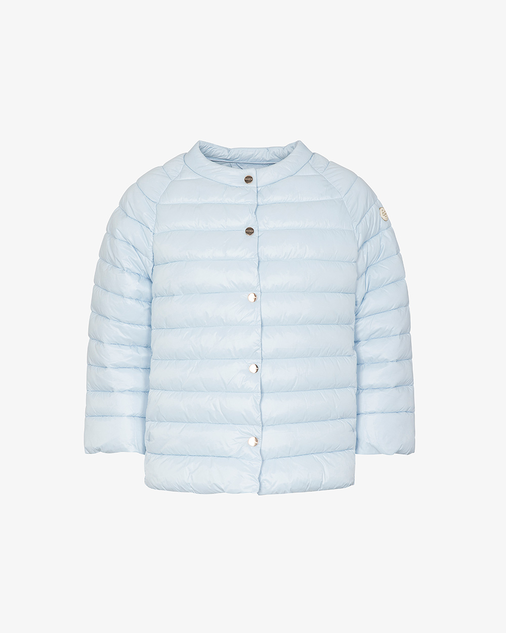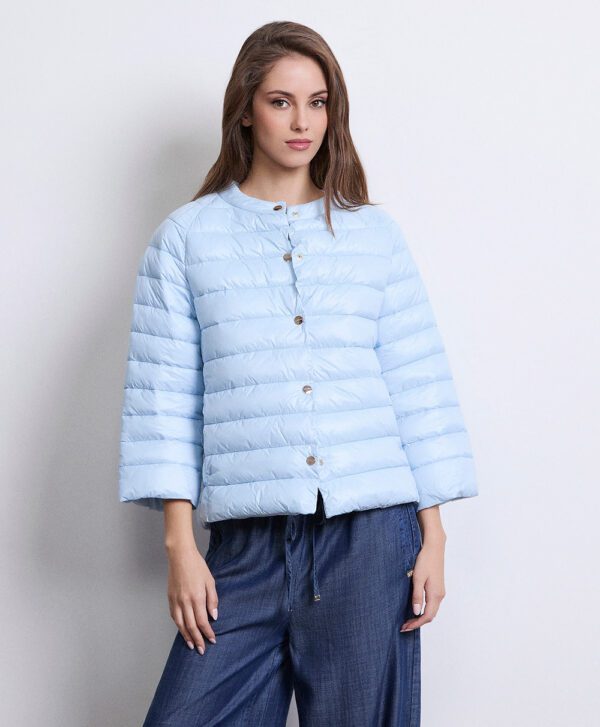 Piumino cappa corto manica 3/4 in nylon ultralight, collo coreano, apertura frontale con bottoni a pressione, tasche frontali inserite.