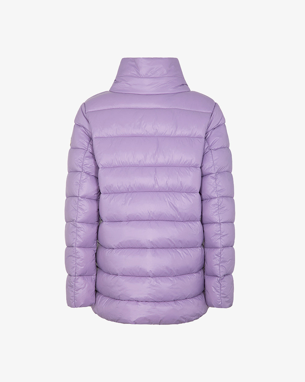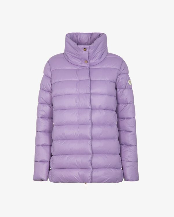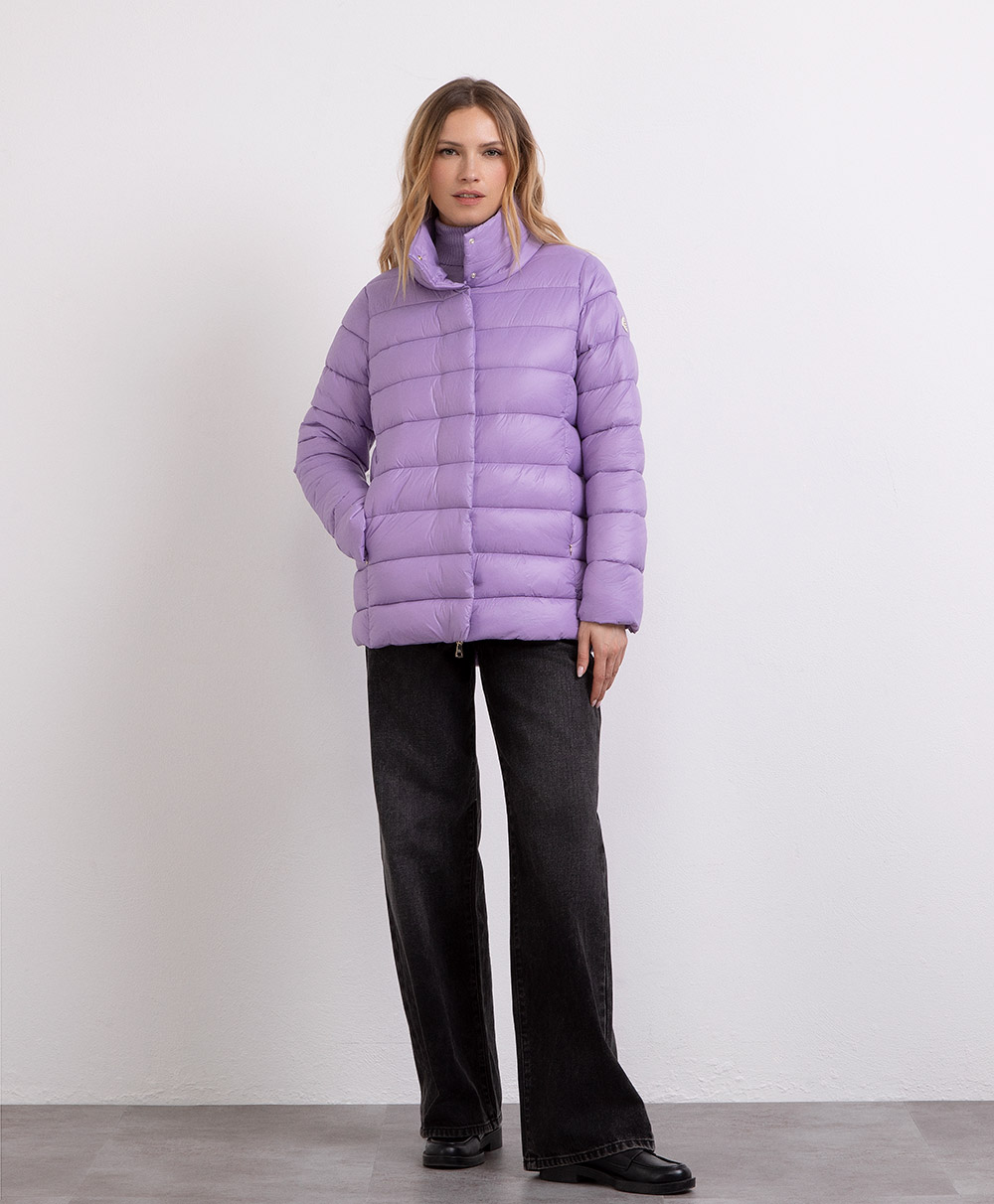 Piumino midi in nylon con collo alto trapunta con cucitura orizzontale, chiusura frontale con cerniera e bottoni a pressione nascosti.