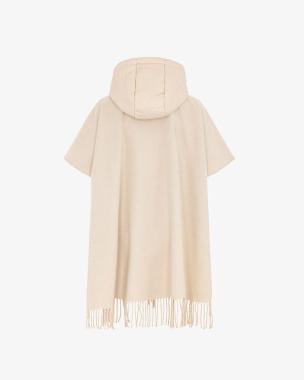 Poncho in panno, fondo con frange. Maniche corte. Cappuccio regolabile in nylon e tasche sul davanti. Chiusura con clip.