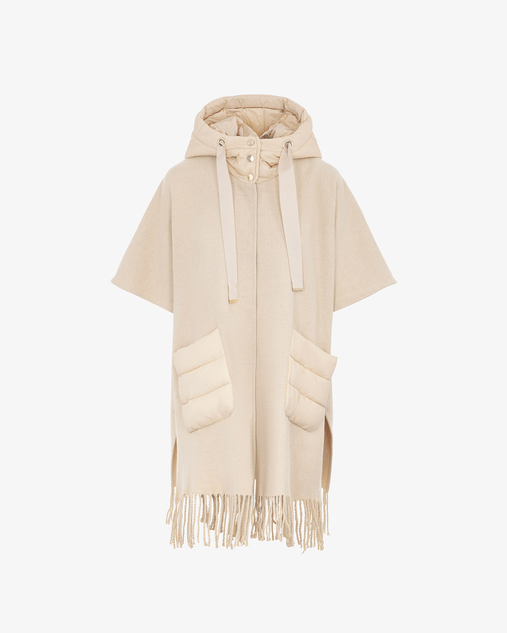 Poncho in panno, fondo con frange. Maniche corte. Cappuccio regolabile in nylon e tasche sul davanti. Chiusura con clip.