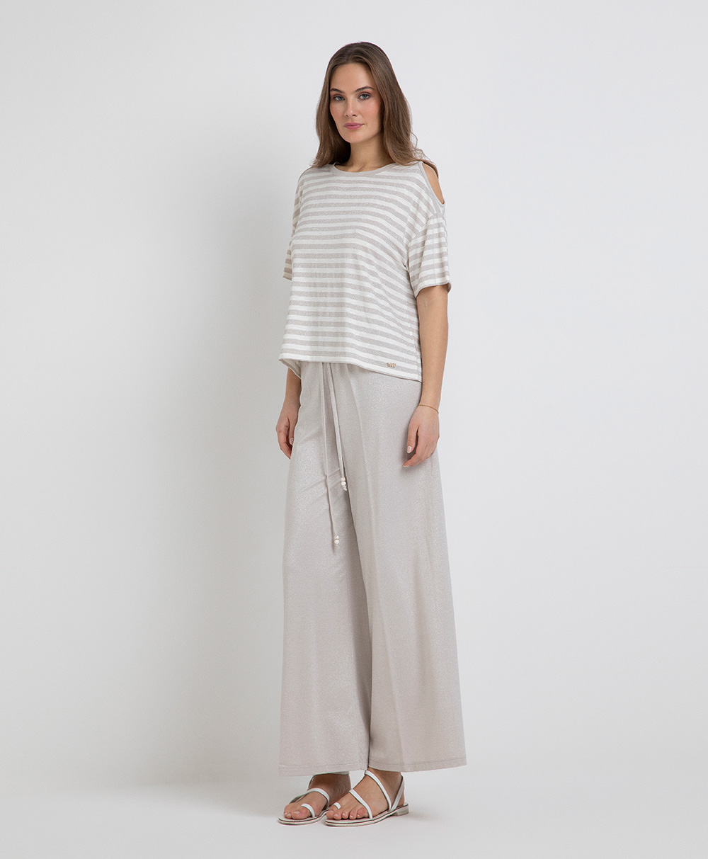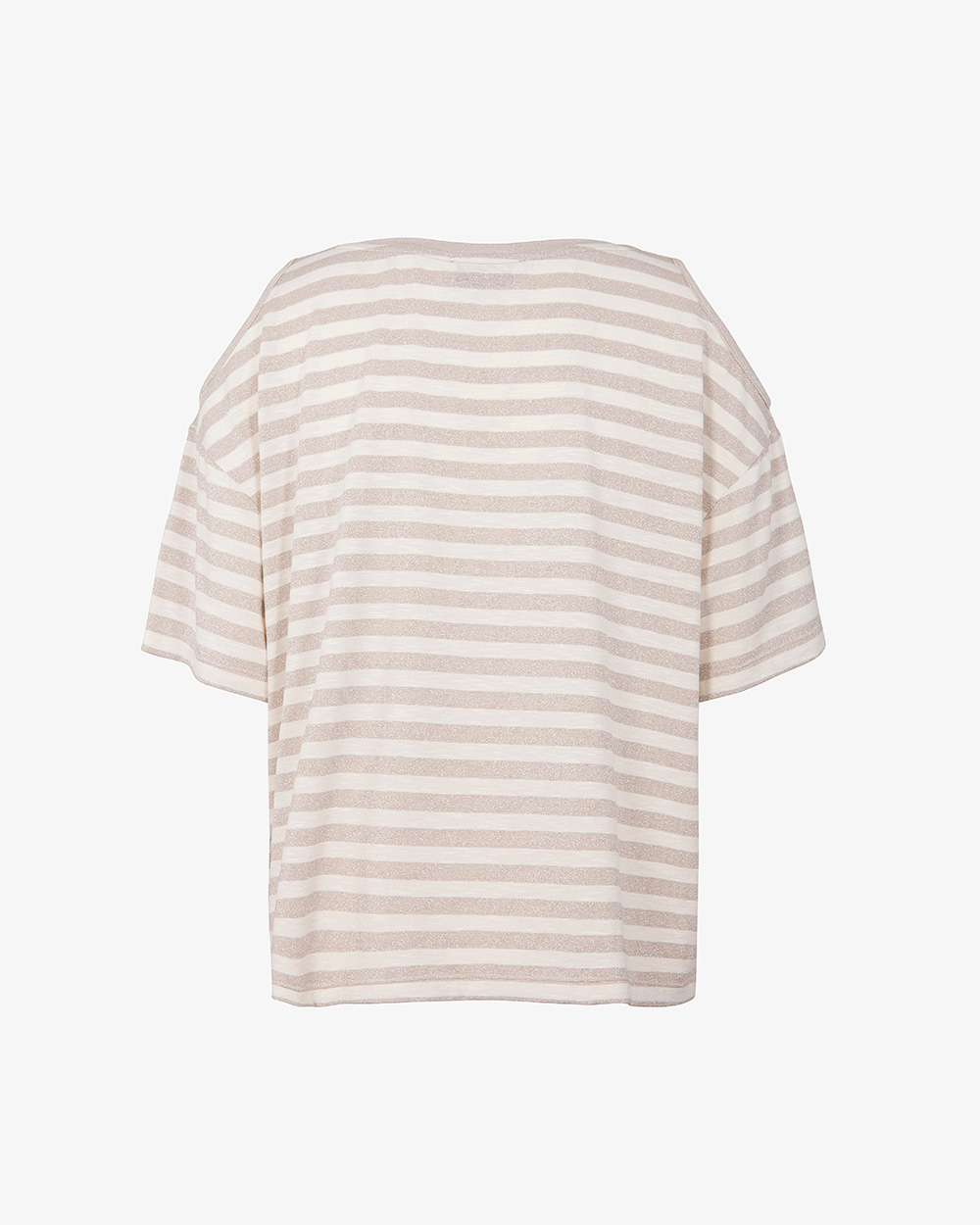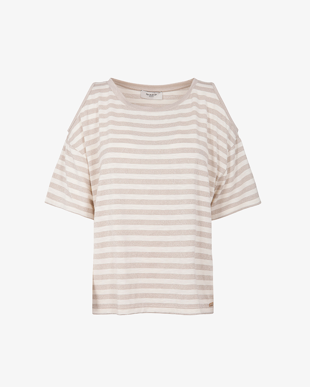 T-shirt con placchetta in metallo a righe ed apertura sulle spalle, in misto viscosa fiammata lurex.